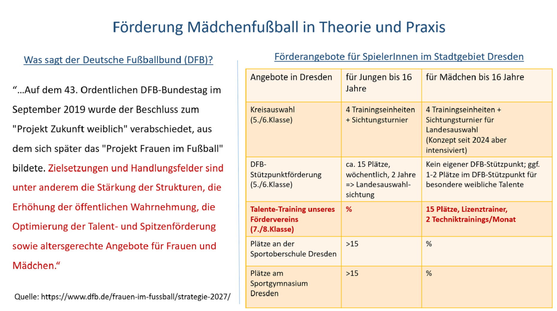 Wir haben uns als Förderverein daher zur Aufgabe gemacht, einen Beitrag zur positiven Entwicklung des Mädchenfußballs in Dresden zu leisten und fundierte Empfehlungen für die Ausbildung Dresdner Fußballerinnen zu erarbeiten. Dazu beraten wir Spielerinnen und deren Familien, bieten ein Talentförderprogramm an, fördern ausgewählte Projekte innerhalb von Fußballvereinen und setzen uns mit den Verantwortlichen der Stadt und des Stadtverbandes Fußball in Dresden zusammen, um die Rahmenbedingungen für junge Fußballerinnen kontinuierlich zu verbessern.