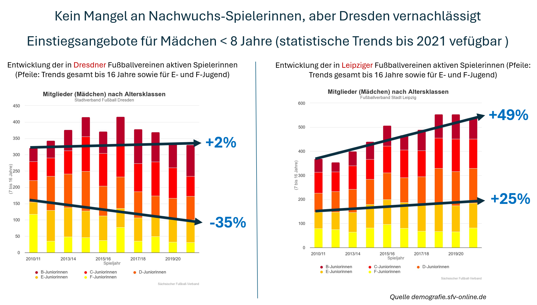 Unser Anliegen ist es, dass der Dresdner Mädchenfußball genauso gefördert und respektiert wird wie der Fußball der Jungs. Wir möchten Vorurteile abbauen und Spielerinnen die Möglichkeit geben, ihre Talente zu entfalten, Selbstbewusstsein aufzubauen, Teamgeist zu stärken und Fairplay zu leben. Obwohl der Frauen- und Mädchenfußball in den letzten 15 Jahren einen Aufschwung erlebt hat, ist dieser in Dresden leider nicht angekommen (s. nachstehende Grafik Mitgliederentwicklung), wobei vor allem ein zu spätes Einstiegsalter der Dresdner Fußballerinnen auffällt und deren Talententwicklung behindert. Die Situation in Leipzig zeigt genau gegenteilige Entwicklungen.